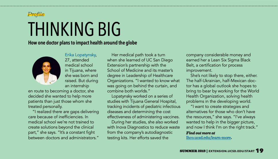 Her medical path took a turn when she learned of UC San Diego Extension’s partnership with the School of Medicine and its master’s degree in Leadership of Healthcare Organizations. “I wanted to know what was going on behind the curtain, and combine both worlds.”